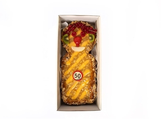 Yes, sara of abraham gezien! Dat mag gevierd worden. Bijvoorbeeld met deze sara of abraham gemaakt van krentenbrood deeg, gevuld met appel en room. Bedekt onder een mooie laag vers fruit. Verpakt in een mooie kadoverpakking. Afmeting 40cm x 18.5 cm